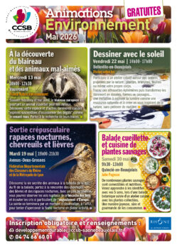 Les animations sont GRATUITES et les places limitées. L’inscription est obligatoire par téléphone 04 74 66 60 01 ou par mail developpementdurable@ccsb-saonebeaujolais.fr