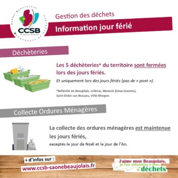 Fermeture déchèteries 1er et 11 novembre Pour rappel, les déchèteries du territoire seront fermées les 1er et 11 novembre prochains.