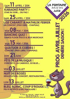 On a retrouvé notre voix suite au karaoké de samedi dernier, on peut donc vous annoncer les prochains évènements à la Fontaine Arts & Vins (Jullié – Beaujolais) :