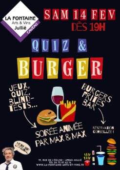 Pour notre reprise après fermeture annuelle, nous avons le plaisir de vous proposer, le samedi 14 février à partir de 19h, une soirée gourmande, ludique et festive : Quiz & Burger !