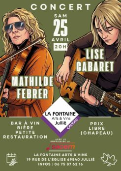 Samedi 25 avril à 20h (ouverture du bar à 19h), nous accueillons en concert au caveau le duo Lise Cabaret et Mathilde Febrer, entrée à prix libre (chapeau), comme d’habitude…